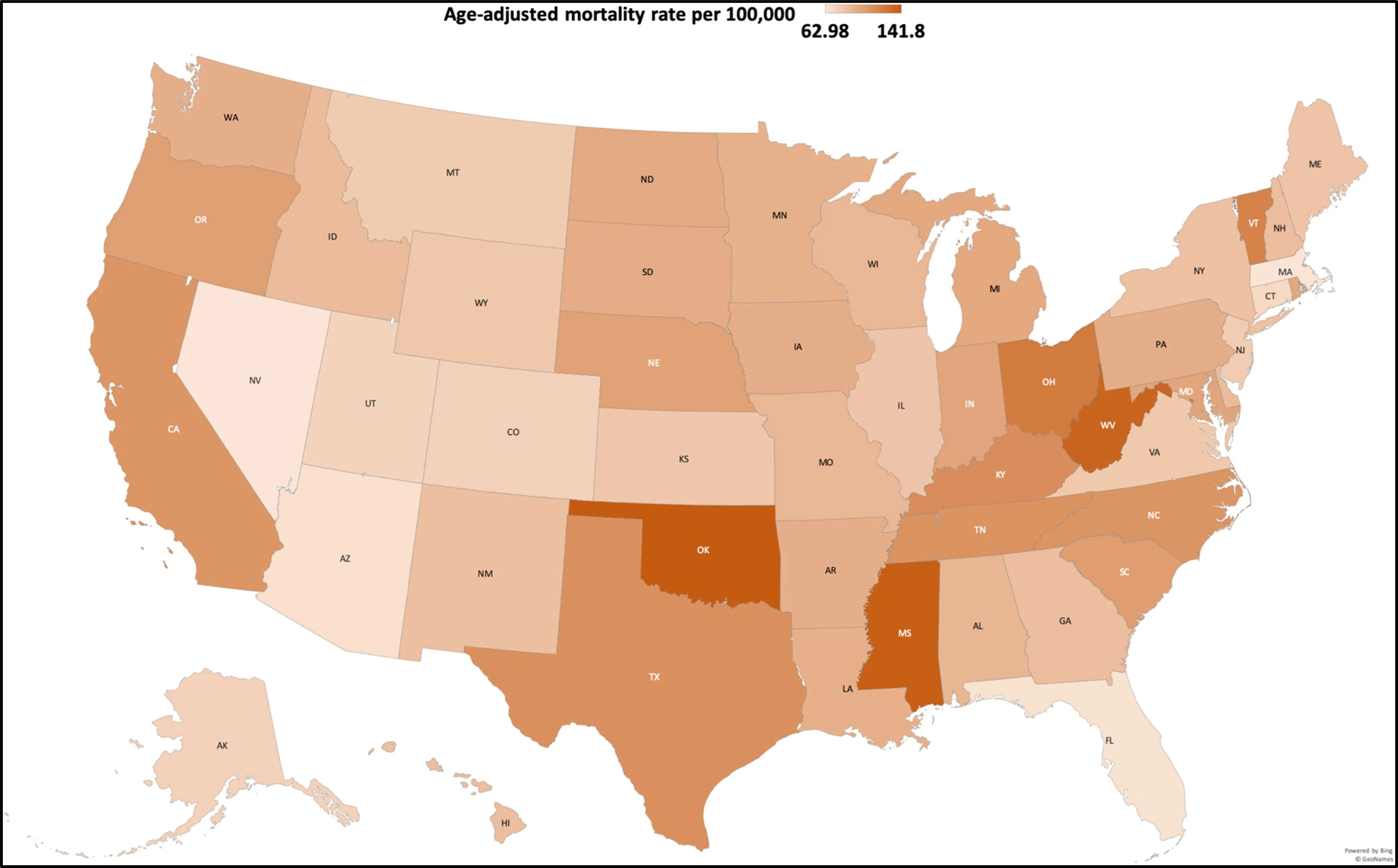 Caption: State level disparities in diabetes mellitus + cardiovascular disease-related mortality in the United States, 1999-2019 (Credit: The American Journal of Medicine).