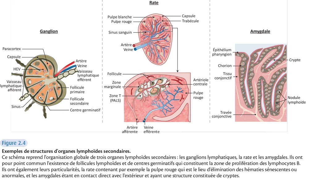 Deux types d'organes lymphoïdes secondaires systémiques sont individualisés : la pulpe blanche de la rate et les ganglions lymphatiques (figure 2.4).
