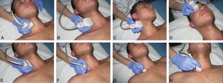 Figure 2.2. Position des sondes pour l'examen des troncs supra-aortiques. a. Artère carotide commune en coupe transverse. b. Artère carotide commune en coupe longitudinale. c. Artère carotide interne en coupe longitudinale. d. Artère ophtalmique. e. Artère vertébrale inter-transversaire. f. Origine de l'artère vertébrale et segment pré-transversaire. g. Artère sous-clavière. h. Tronc artériel brachio-céphalique et sa bifurcation.