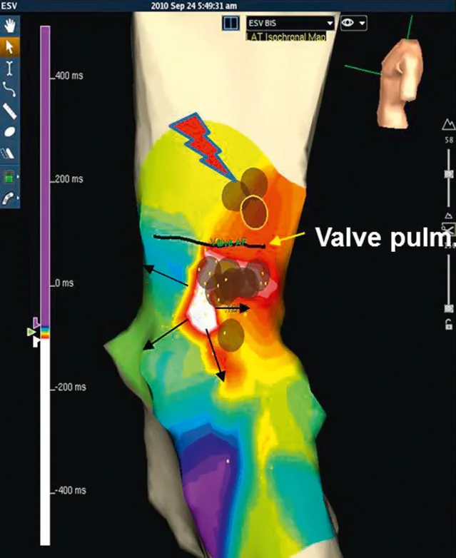 B. La cartographie d'activation électro-anatomique (vue latérale gauche) montre que la zone de primo-dépolarisation ventriculaire droite (couleur blanche) est située sous l'anneau pulmonaire dans sa portion latérale. L'ablation à ce niveau (points marrons) était inefficace.