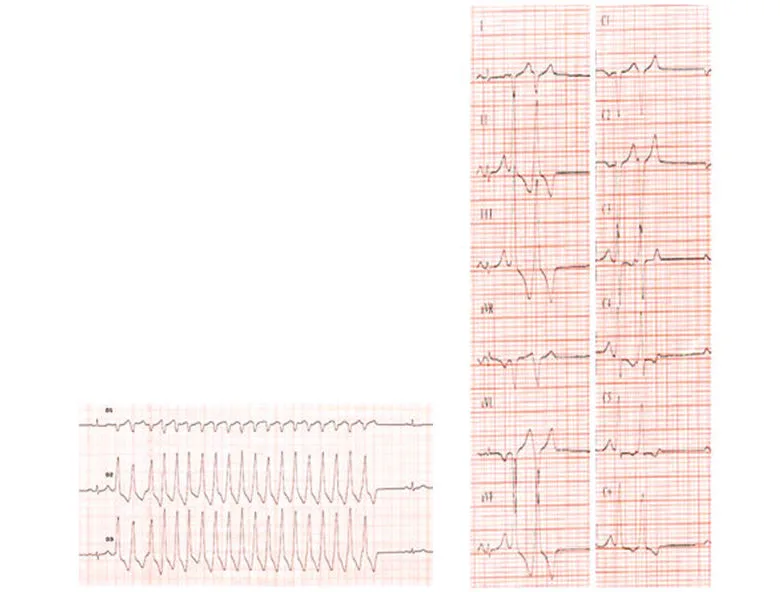 A. Femme de 43 ans avec palpitations itératives en rapport avec des extrasystoles ventriculaires et des tachycardies ventriculaires non soutenues en salves avec une morphologie de retard gauche – axe inférieur. La transition RS dans les précordiales est en V3 mais l'onde R est minime ou absente en V1, évoquant une origine au niveau de la chambre de chasse du ventricule droit. Le complexe QRS ectopique est négatif (QS) en D1, plus ample en D3 qu'en D2, évoquant une origine au niveau de l'artère pulmonaire.