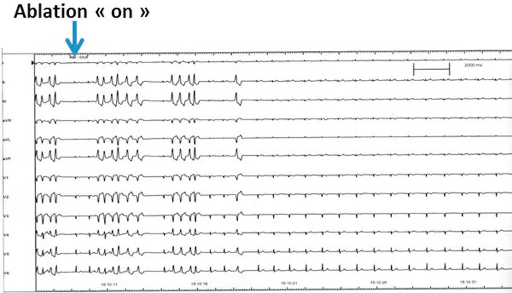 D. L'ablation à ce niveau (éclair rouge sur la cartographie électro-anatomique) entraîne la disparition immédiate des extrasystoles ventriculaires.