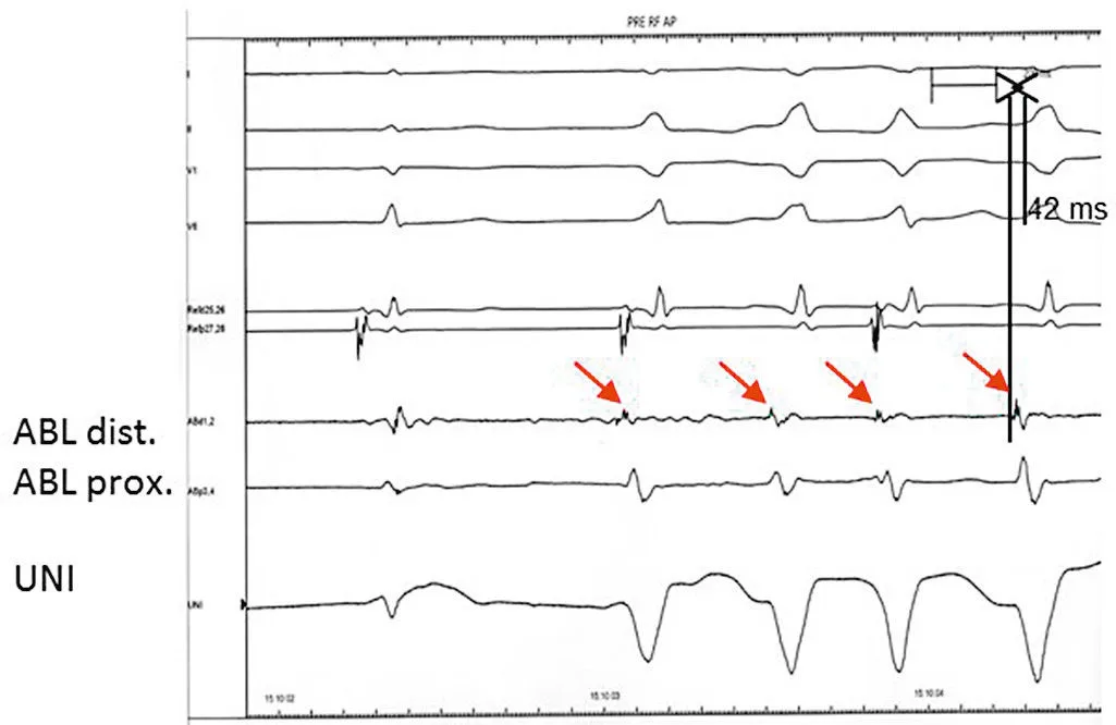 C. La cartographie dans l'artère pulmonaire avec le cathéter d'ablation environ 1 cm au-dessus de l'anneau révèle un potentiel présystolique (flèches rouges) très peu volté (0,2 mV) précédant le complexe QRS de 42 ms. Le potentiel unipolaire est QS.