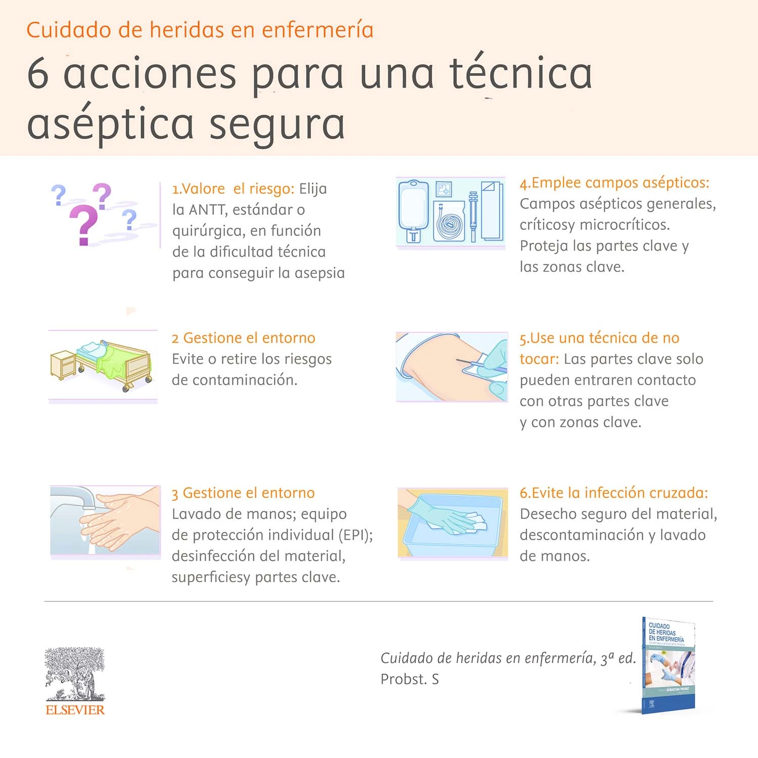 Más información y referencias: Capítulo 3: 'Principios de las intervenciones en las heridas', Cuidado de heridas en enfermería, de Sebastina Probst. Texto e imagen: páginas 44-48 ó consúltalo a través de nuestra plataforma de formación interactiva ClinicalKey Student