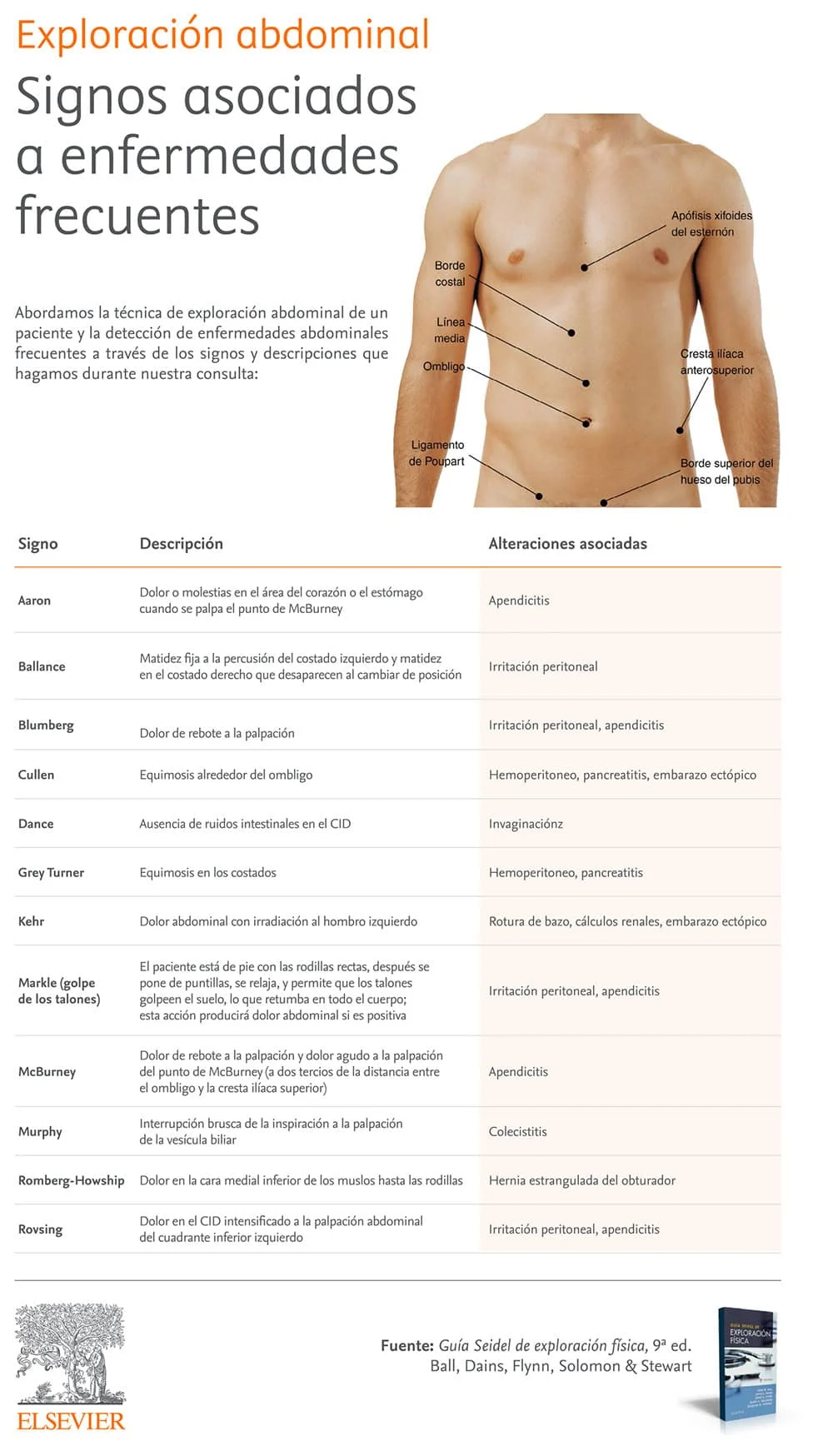 Cómo saber llevar a cabo una exploración física a nuestro paciente es clave para detectar signos que nos lleven al diagnóstico de una alteración o enfermedad grave. La novena edición de la Guía Seidel de exploración física es un manual clínico que por su fácil manejo, breves descripciones de las técnicas de exploración y las directrices sobre el modo en el que las exploraciones han de desarrollarse, es ideal para aprender y automatizar esta habilidad. Este título está diseñado para estudiantes de Enfermería y Medicina y profesionales de disciplinas sanitarias, y cuenta con numerosas ilustraciones intercaladas en el texto que sirven de apoyo para la mejor comprensión de las técnicas y los posibles hallazgos. Hoy abordamos la exploración abdominal a través de una tabla resumen (arriba) con los signos, descripciones, y alteraciones asociadas a la apendicitis, pancreatitis, irritación peritoneal, hemoperitoneo, cálculos renales, embarazo ectópico...