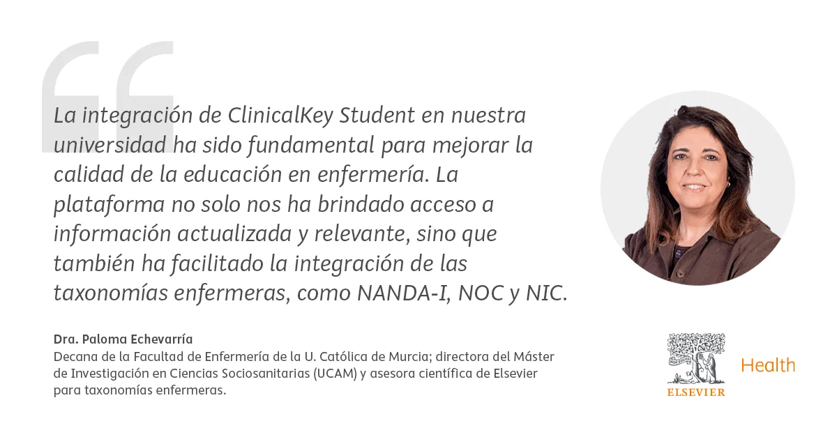 La Dra. Elena Martínez Sanz, profesora del Departamento de Anatomía y Embriología de la Facultad de Medicina de la Universidad Complutense de Madrid, destaca que ClinicalKey Student ahorra tiempo y enriquece las clases. Permite localizar fácilmente recursos médicos relevantes, crear materiales interactivos en minutos y contar con recursos específicos para distintas disciplinas. Su función de evaluación ayuda a preparar exámenes, identificar áreas de dificultad y promover la autoevaluación de los alumnos. Además, las cartas educativas y herramientas como Bookshelf facilitan el repaso y el trabajo en equipo, incluso en modo offline.