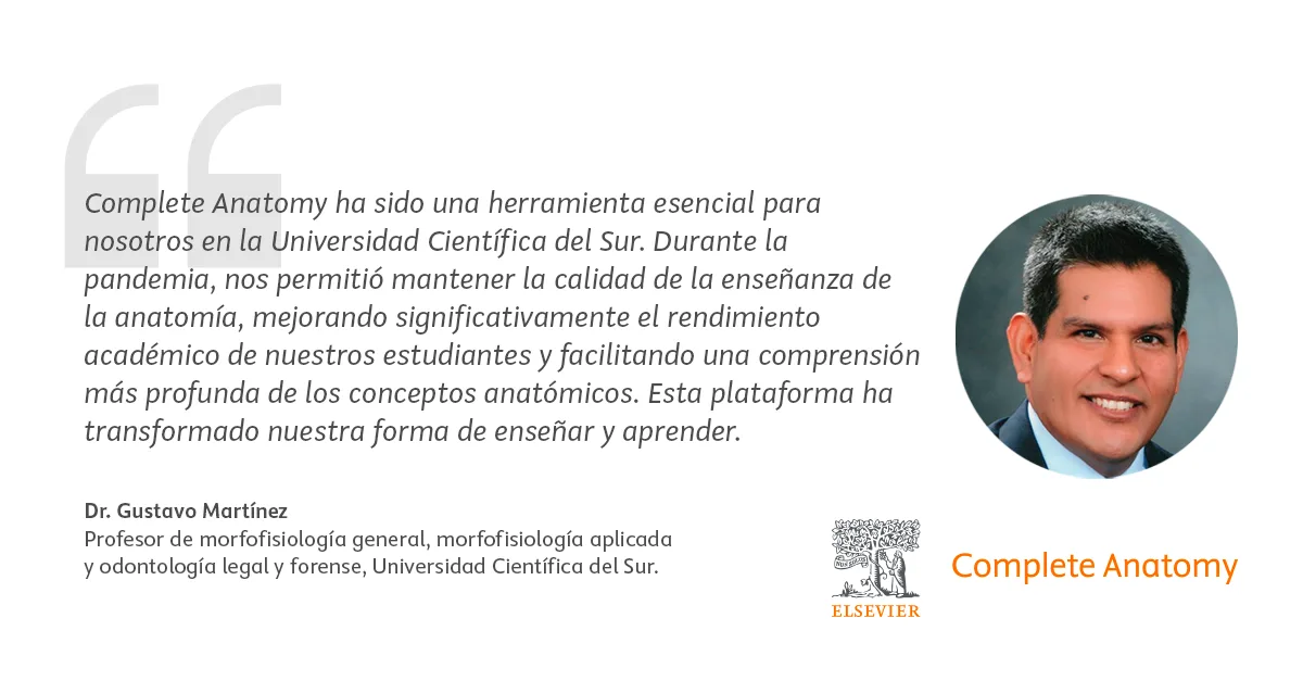 Complete Anatomy ha revolucionado la enseñanza de la anatomía en la Universidad Científica del Sur, convirtiéndose en una herramienta indispensable para estudiantes y docentes. Como señala el Dr. Gustavo Martínez, Profesor de Morfofisiología General, Morfofisiología Aplicada y Odontología Legal y Forense, "Complete Anatomy ha transformado nuestra forma de abordar la enseñanza, ofreciendo un enfoque interactivo que enriquece la experiencia educativa".