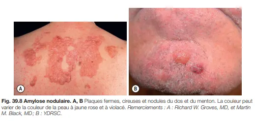 L'amylose nodulaire se présente comme une ou plusieurs plaques ou nodules cireux, couleur de la peau à rose orange, plus souvent sur le tronc ou les membres (fig. 39.8); la protéine précurseur est une Ig à chaînes légères ± β2 -microglobuline, produite par les infiltrats cutanés plasmocytaires.