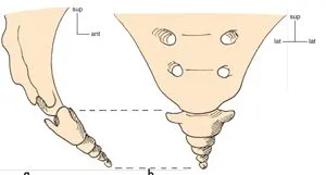 1-43 Coccyx en vues latérale droite (a) et antérieure (b).