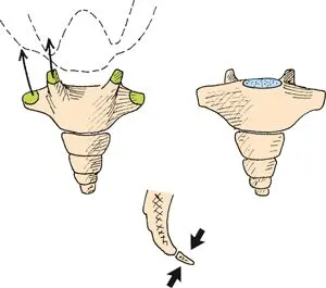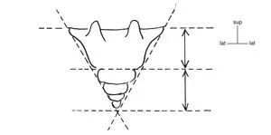 la vue postérieure : dessiner un triangle équilatéral à sommet inférieur (fig. 1-48) dont les angles supérieurs sont accentués par les processus transverses. Ajouter les cornes débordant légèrement du bord supérieur. Le corps de la 1re pièce coccygienne fait 50 % de la taille de l’os ;