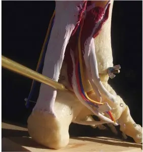 Figure 20.15 Vue postéro-médiale d’une cheville gauche. Visualisation du trajet de l’instrumentation postéro-médiale, du LFH et du paquet neurovasculaire tibial postérieur.Arthrodese-16-300x181.jpg
