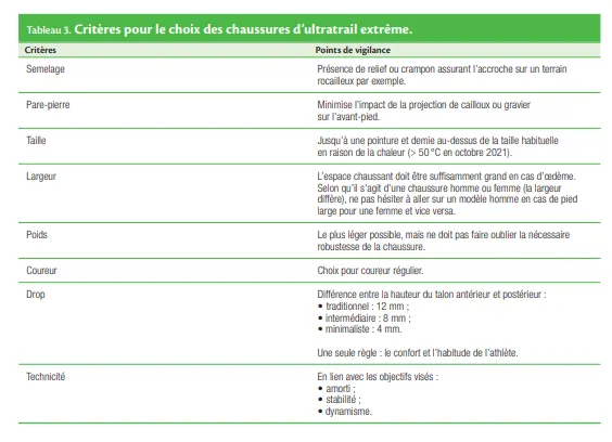 En fonction de l’examen clinique et des antécédents du patient, le podologue devance les points de fragilité possible de l’athlète. L’ensemble de ces indicateurs, couplé aux données de la course, aiguille pour conseiller l’athlète dans le choix de ses chaussures. Plusieurs points de vigilance sont à retenir (Tableau 3).