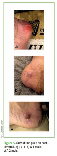 Ces facteurs généraux expliquent le retard de régénération des tissus. La surveillance des lésions podales (Figure 5) incombe au podologue. Il prévoit une consultation au retour en France, puis une fois par mois jusqu’à cicatrisation complète des plaies.