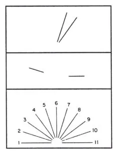 Les déficits des jugements de direction de lignes peuvent être objectivés en présentant au sujet des paires de lignes de direction différente et de choisir les deux lignes de même direction dans une disposition étalonnée disposée en éventail (Benton, 1978 ; figure 8.1).