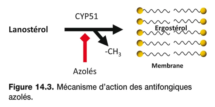 L’activité thérapeutique des azolés est fongistatique, elle résulte de l’inhibition du CYP450 fongique (CYP51) qui catalyse la déméthylation du 14- α -lanostérol, phase essentielle de la biosynthèse de l’ergostérol fongique ( figure 14.3 ). Cette inhibition entraîne une accumulation de 14- α -méthylstérol associée à une diminution de l’ergostérol dans la membrane cellulaire fongique qui conduit à une inhibition de la croissance fongique. De plus, au niveau cellulaire, l’accumulation de lanostérol altère la perméabilité membranaire, la chaîne respiratoire ainsi que la synthèse de chitine provoquant la mort du champignon. Les azolés ont montré une plus grande sélectivité pour les enzymes du CYP450 fongiques que pour les autres systèmes enzymatiques du CYP450 mammifères. Sur le plan moléculaire, un des atomes d’azote (le N-3 chez les imidazolés et le N-4 chez les triazolés) se lie à l’atome de fer de l’hème situé au niveau du site actif du CYP51 fongique, inhibant de manière irréversible l’activité de ce cytochrome. Certains azolés présentent un mode d’action complémentaire, susceptible d’élargir leur spectre d’action : le voriconazole possède par exemple une activité 24-methylène-dihydrolanostérol déméthylase sur certaines levures/filamenteux et l’itraconazole un pouvoir inhibiteur de la chitine synthase chez les levures . On observe cependant une augmentation croissante d’échecs Figure 14.2 . Structure chimique des antifongiques azolés. A. Antifongiques triazolés à usage systémique. B. Principaux antifongiques imidazolés thérapeutiques associés à la sélection de souches multirésistantes du fait de l’utilisation intensive des fongicides ou fongistatiques en santé humaine ou en agriculture. Le choix du traitement doit se faire selon la nature et la sensibilité de l’agent pathogène, le spectre d’action du médicament, l’état clinique du patient, les comédications susceptibles d’interférer avec l’antifongique. Au cours des infections systémiques impliquant des agents pathogènes rares et/ou en cas d’échec thérapeutique, un antifongigramme est recommandé pour déterminer la CMI du germe. Il sera accompagné de l’identification d’espèce et pourra conduire au choix de la molécule au rapport efficacité/coût le plus favorable.
