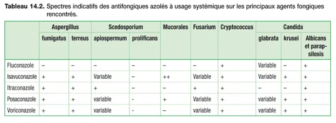 Les triazolés sont utilisables par voie systémique dans le traitement curatif et/ou prophylactique des infections fongiques. Le traitement prophylactique est particulièrement utile chez les sujets présentant des facteurs de risque d’infections fongiques (neutropénies, cancer, greffes de cellules souches hématopoïétiques, transplantation d’organe, immunodépression, etc.). Le fluconazole , le voriconazole et le posaconazole sont indiqués dans les traitements prophylactiques et curatifs d’infections fongiques à levures ou filamenteux. L’isavuconazole et l’itraconazole sont indiqués dans les traitements uniquement curatifs des infections fongiques. Les spectres d’effi cacité indicatifs des antifongiques azolés à usage systémique sont présentés dans le tableau 14.2 . Par ailleurs, il existe de nombreux antifongiques imidazolés, ce sont des agents topiques actifs contre une variété de pathogènes dont : Epidermophyton, Microsporum, Trichophyton, Candida ou Malassezia.