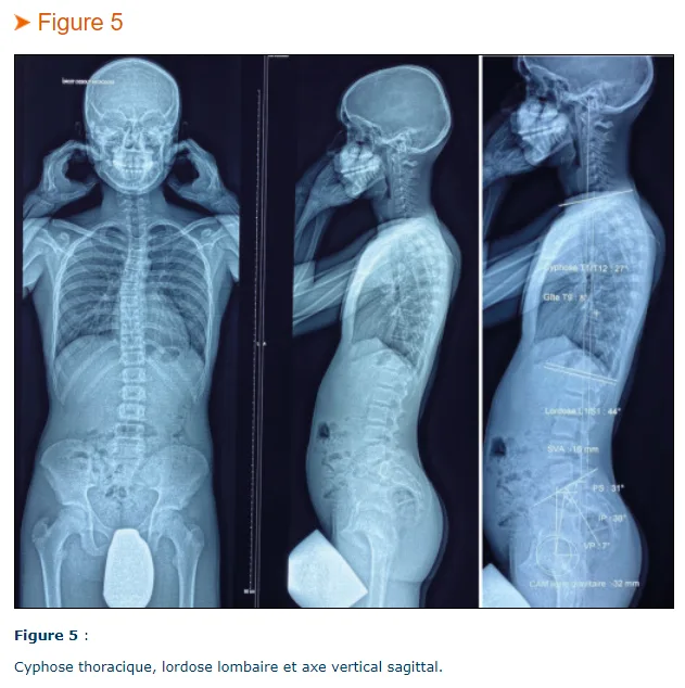 Cyphose thoracique (Figure 5) [2]. Elle est évaluée par l’angle entre les plateaux vertébraux T2 et T12 ou de T5 à T12, et comparée aux valeurs :