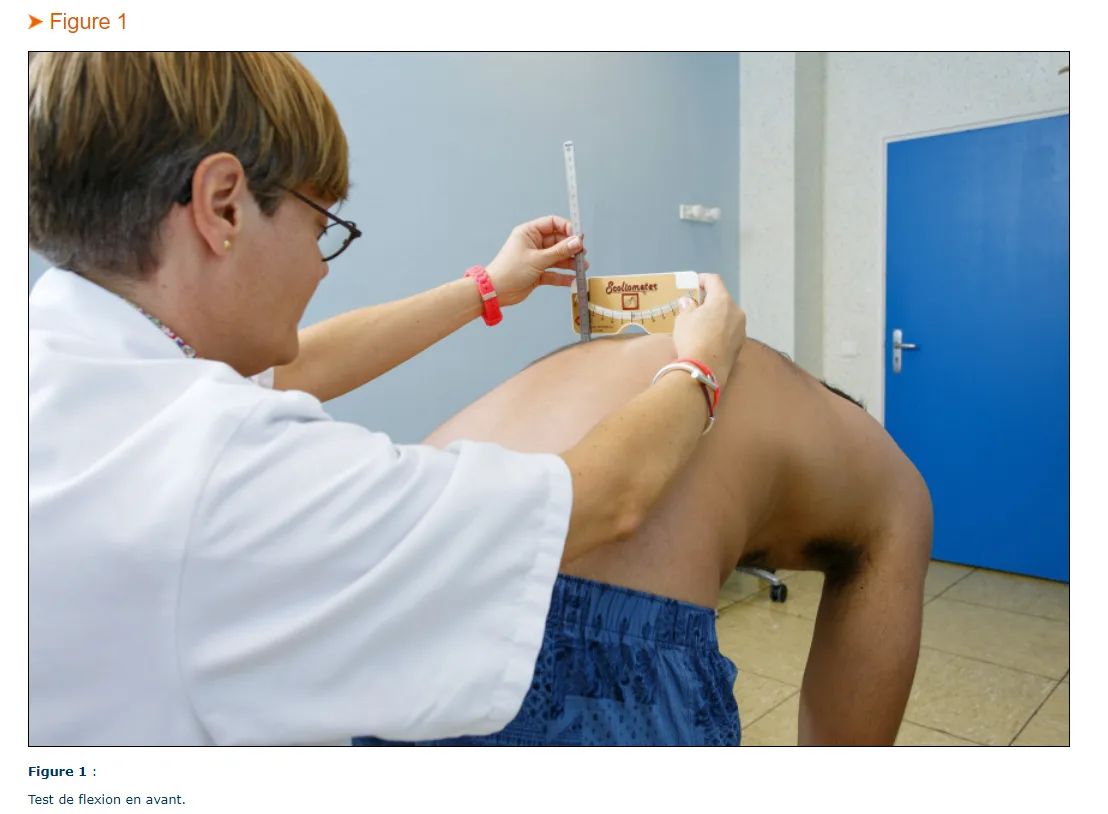 est de flexion en avant [9] : test du plongeur (présence d’une gibbosité avec inclinomètre, vérifier si raideur des ischio-jambiers) (Figure 1). Si le praticien retrouve une valeur supérieure à 7°, il est nécessaire de réaliser une imagerie.