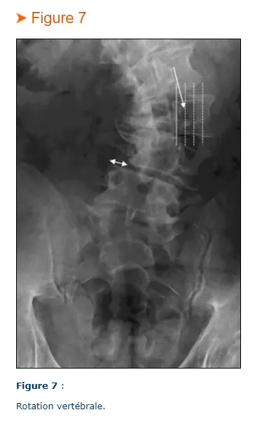 Rotation vertébrale (Figure 7). La cotation se fait avec la méthode de Nash-Moe [15] (position des pédicules vertébraux par rapport au corps vertébral). L’échelle comprend cinq points.