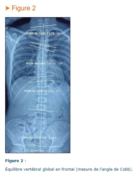 L’angle de Cobb mesure le degré de déformation latérale de la colonne vertébrale. Deux droites sont tracées, l’une partant de la vertèbre avec le plus grand angle d’inclinaison au-dessus de l’apex de la courbe scoliotique, et l’autre partant de la vertèbre avec le plus grand angle de déclinaison sous le sommet de la courbe scoliotique (Figure 2).