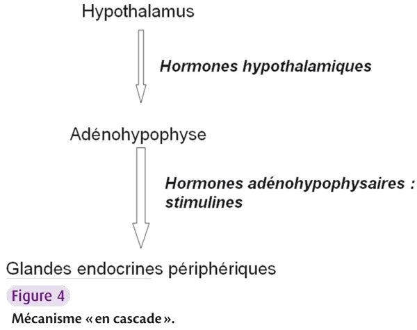 Il est relié à l'hypophyse par la tige hypophysaire (infundibulum) établissant une relation neuronale étroite par la transmission de neuromédiateurs hypothalamiques (axe hypothalamo-hypophysaire), ainsi qu'à d'autres glandes endocrines (ex. : les gonades) permettant un rétrocontrôle (ou feed-back). Il commande les principales fonctions de l'organisme par un mécanisme « en cascade » (figure 4).