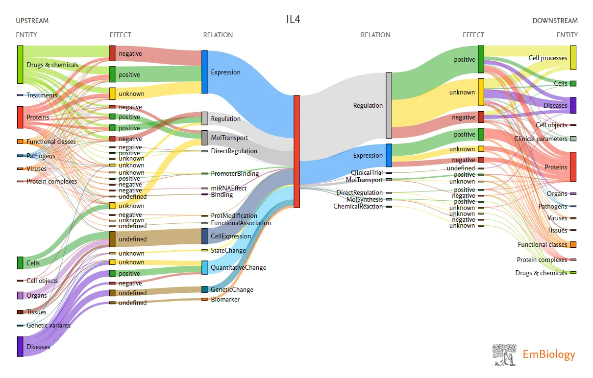 Caption: Initial view in EmBiology showing upstream and downstream relationships, including effect, on the drug target IL4. Users apply advanced filters to narrow results and can explore associated references.