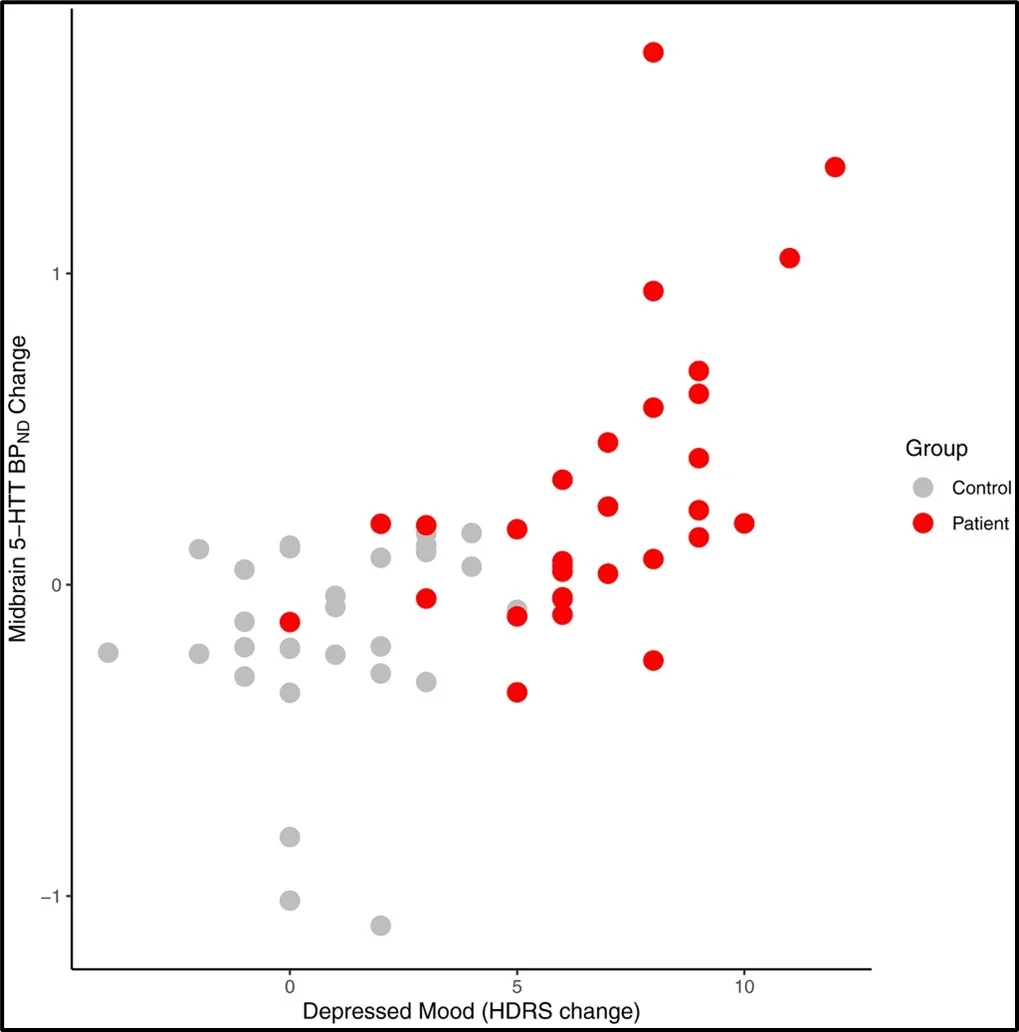 Caption: Serotonin transporter binding (5-HTT BPND) in midbrain across the menstrual cycle correlates with the severity of depressed mood in patients with PMDD (red circles) (Credit: Biological Psychiatry).