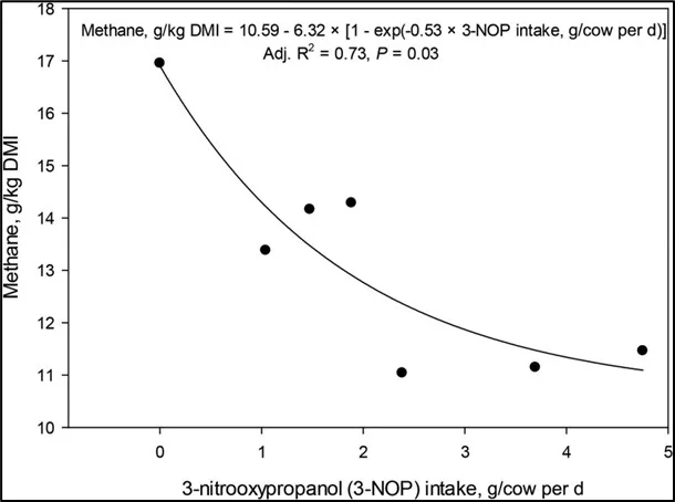 Relationship of 3-nitrooxypropanol (3-NOP) intake and enteric methane emission yield (g/kg of DMI) in dairy cows. Data are treatment means from Melgar et al., 2020b). Adj. R2 = adjusted R2 (Credit: Journal of Dairy Science).