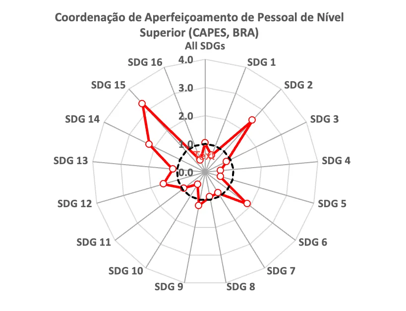 Relative Activity Index for each SDG and for any SDG, considering the publications that acknowledge support by the Coordination for Training Higher Education Personnel (CAPES, Brazil). The black dashed circle shows the World average publication activity for each SDG.