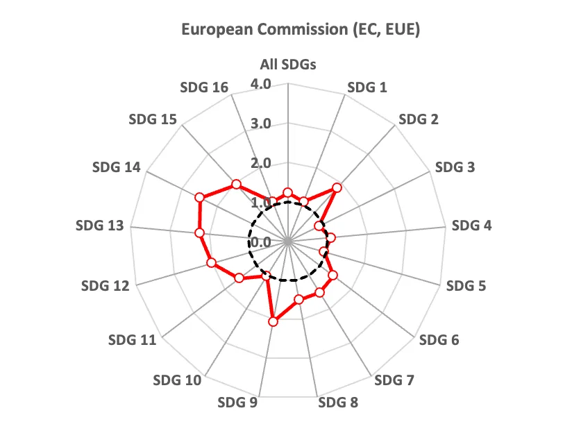 The European Commission shows a Relative Activity Intensity curve that is twice above the World average for SDG 15 (Life on Land) and 2.5 times the World average for SDG 14 (Life below Water).
