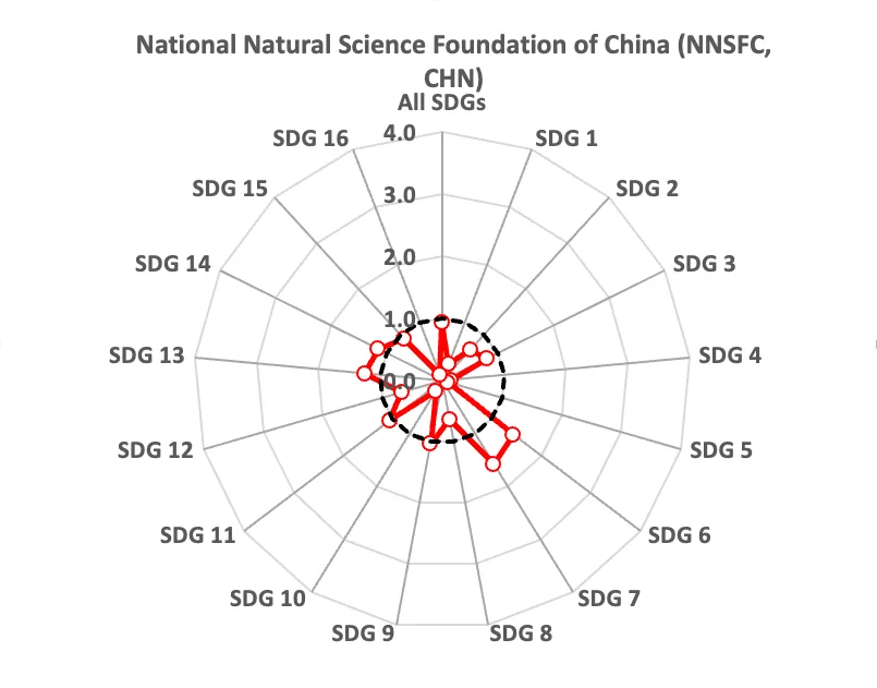 Relative Activity Index for each SDG and for any SDG, considering the publications that acknowledge support by the National Natural Science Foundation of China (NSFC, China). The black dashed circle shows the World average publication activity for each SDG.