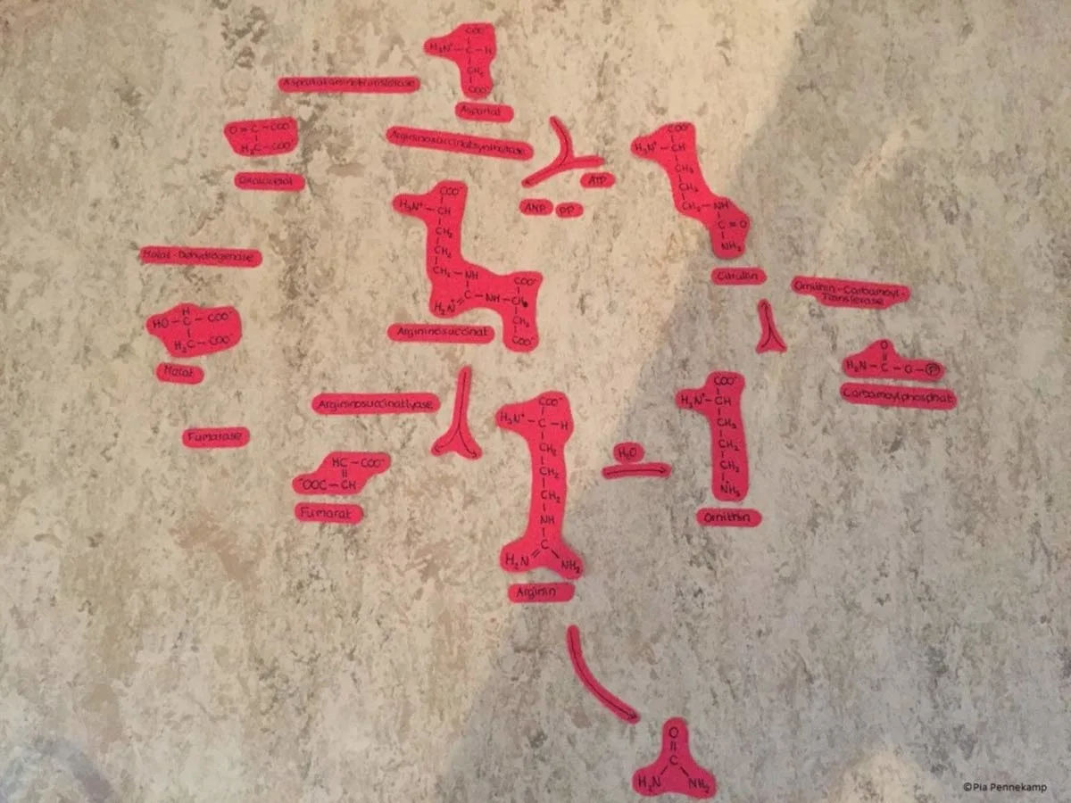 Einen weiteren Ratschlag, um auch die großen Zusammenhänge auswendig zu lernen, habe ich aus den Medilearnskripten. In dem Skript zum Citratzyklus stand in einer Fußnote, man könne sich die einzelnen Schritte aufmalen, ausschneiden und versuchen den Zyklus wieder zusammenzubasteln. Ich habe das noch etwas intensiviert und mir bunte Pappe gekauft. Jedes einzelne Substrat, jeder Name und jeder Pfeil ist jetzt auf Pappe und einzeln ausgeschnitten. Und das nicht nur vom Citratzyklus, sondern auch von Glykolyse, Harnstoffzyklus, Gluconeogenese, und vielen weiteren Stoffwechselwegen. Zuerst puzzle ich den Stoffwechselweg und dann male ich die Einzelschritte auf die Zaubertafel. Inzwischen kann ich die meisten tatsächlich auswendig, obwohl ich vorher wirklich Sorge hatte, wie ich das jemals in meinen Kopf kriegen könnte.
