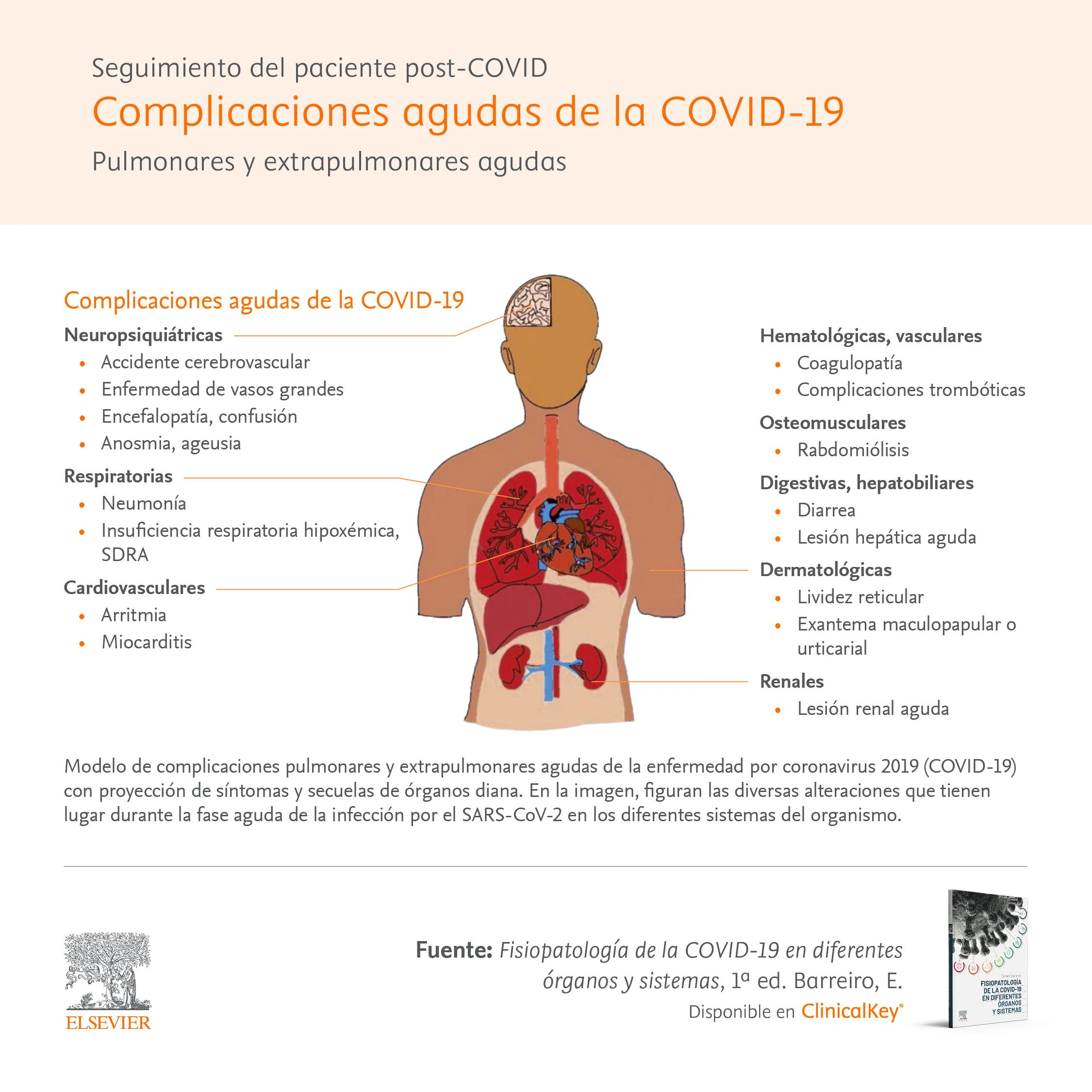 A lo largo de las últimas semanas hemos ido abordando diferentes aspectos de la COVID-19: sus efectos a largo plazo o sus complicaciones neurológicas agudas y post agudas. Esta revisión la hemos basado en el nuevo manual Fisiopatología de la COVID-19 en diferentes órganos y sistemas, un de estudio imprescindible para los profesionales interesados en aprender más sobre esta enfermedad. Hoy ofrecemos el último capítulo de la serie a través de dos visuales sobre las complicaciones agudas de la COVID-19: pulmonares y extrapulmonares.