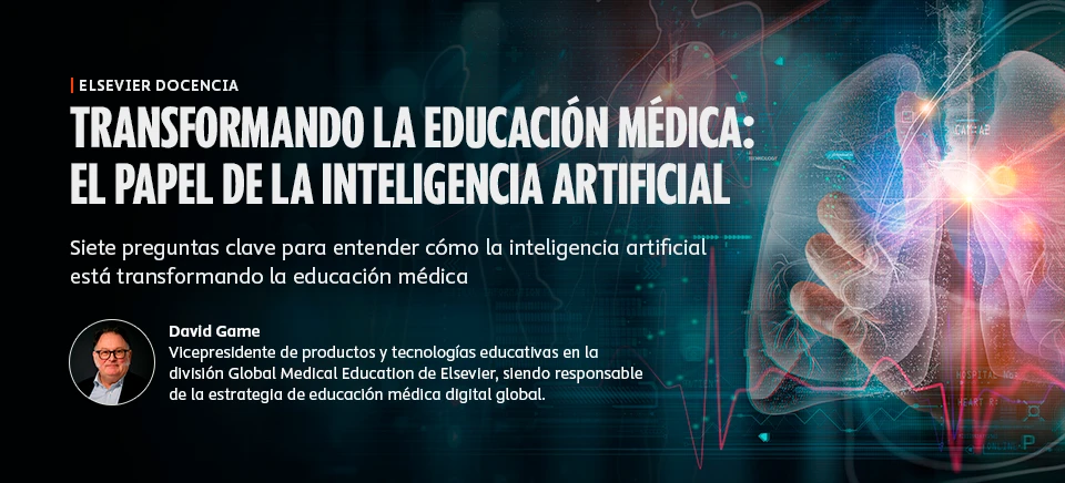 En Elsevier Docencia, el espacio para docentes de Ciencias de la Salud que buscan la excelencia en el aprendizaje de sus alumnos, nos hemos sentado con David Game, SVP Global Product, Global Medical Education en Elsevier. Con él charlamos en su momento del primer gran reto del s.XXI en la educación médica: la COVID. Ahora, abordamos el segundo: la llegada de la inteligencia artificial (IA) a la formación y práctica clínica. Descubre a través de siete preguntas clave el impacto revolucionario de la IA en este campo crucial.