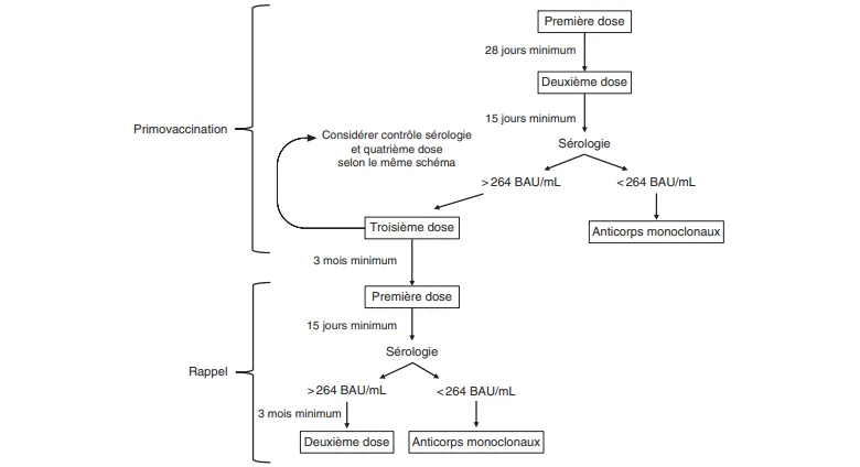 Dans le cadre de la campagne de rappel vaccinal, ces patients sont éligibles à une dose de rappel trois mois après leur dernière dose. La réponse sérologique 15 jours après la vaccination permet à nouveau d'orienter l'indication des Ac monoclonaux (inférieure à 264 BAU/mL). Enfin, l'administration d'une deuxième dose de rappel est maintenant indiquée chez les patients sévèrement immunodéprimés dans un délai de trois mois après le premier rappel. Ces recommandations sont résumées dans la figure 2.2. À noter que les patients recevant un autre traitement immunosuppresseur ne sont pas concernés par ces recommandations spécifiques et suivent celles de la population générale.