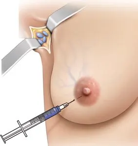 Le colorant lymphotrope (1 à 2 mL de bleu patenté V pur, parfois moins) est injecté en péri-aréolaire, le plus souvent, ou en péritumoral ou dans le quadrant concerné en début d’intervention selon les auteurs (fig. 4.2a). Un délai de 10 minutes est nécessaire avant l’incision cutanée au niveau du creux axillaire sur 15 à 20 mm. La recherche du ganglion sentinelle est visuelle après ouverture de l’aponévrose clavi-pectoro-axillaire. On prendra garde de ne pas sectionner le lymphatique coloré. On recherche minutieusement à la partie basse de l’aisselle un vaisseau lymphatique bleuté. Dès qu’il est repéré, il peut être suivi à l’aide d’un dissecteur jusqu’au premier ganglion bleu. Celui-ci(ceux-ci) est(sont) prélevé(s) électivement. Un ou plusieurs ganglions (deux en moyenne) peuvent être bleus (fig. 4.2b). La position de ces ganglions est souvent la même, très proche de la veine thoracique latérale