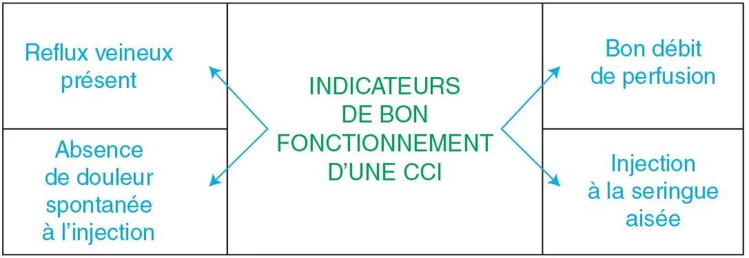 L'absence d'un ou de plusieurs indicateurs doit alerter sur de possibles complications. En cas de douleur, rougeur, gonflement : penser à une extravasation (voir fiche 7).