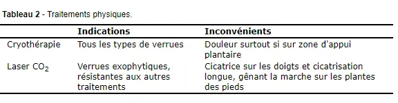 Le laser CO2 est un traitement presque toujours efficace sur les verrues. Mais il laisse une érosion douloureuse qui peut mettre 2 à 6 semaines à cicatriser. Les cicatrices au niveau des plantes sont minimes. Elles peuvent être plus gênantes sur les doigts. Il est donc indiqué dans les verrues profuses, résistantes aux traitements habituels. Pas plus que les autres traitements, il n'évite les récidives Au total : ainsi, actuellement, le traitement des verrues doit prendre en compte la localisation des verrues et leur ancienneté. On peut raisonnablement proposer le schéma suivant :