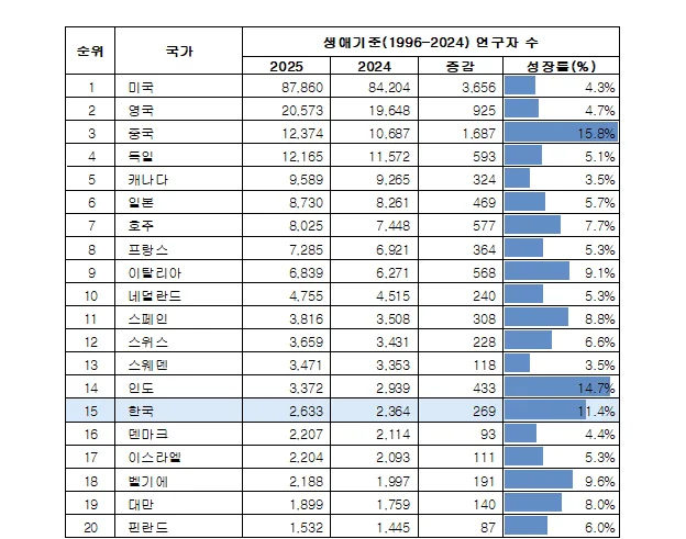 1960년부터 2023년까지의 논문(2024년 8월 1일 기준)을 분석한 전 세계 상위 2% 연구자 리스트에 따르면, 한국의 연구자는 2023년 대비 12% 증가해 2,364명으로, 전세계 15위를 유지하면서, 2년 연속 두 자리 수 성장을 지속하고 있는 것으로 나타났습니다.