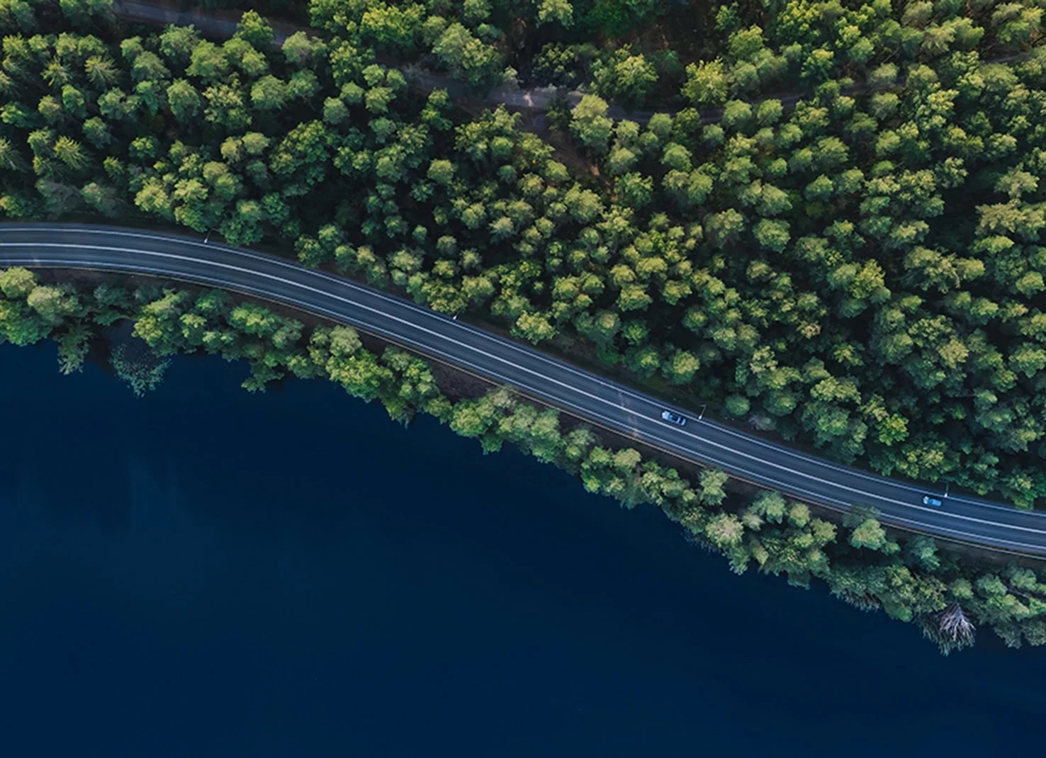 Cars on a two lane road cutting through forest near a body of water