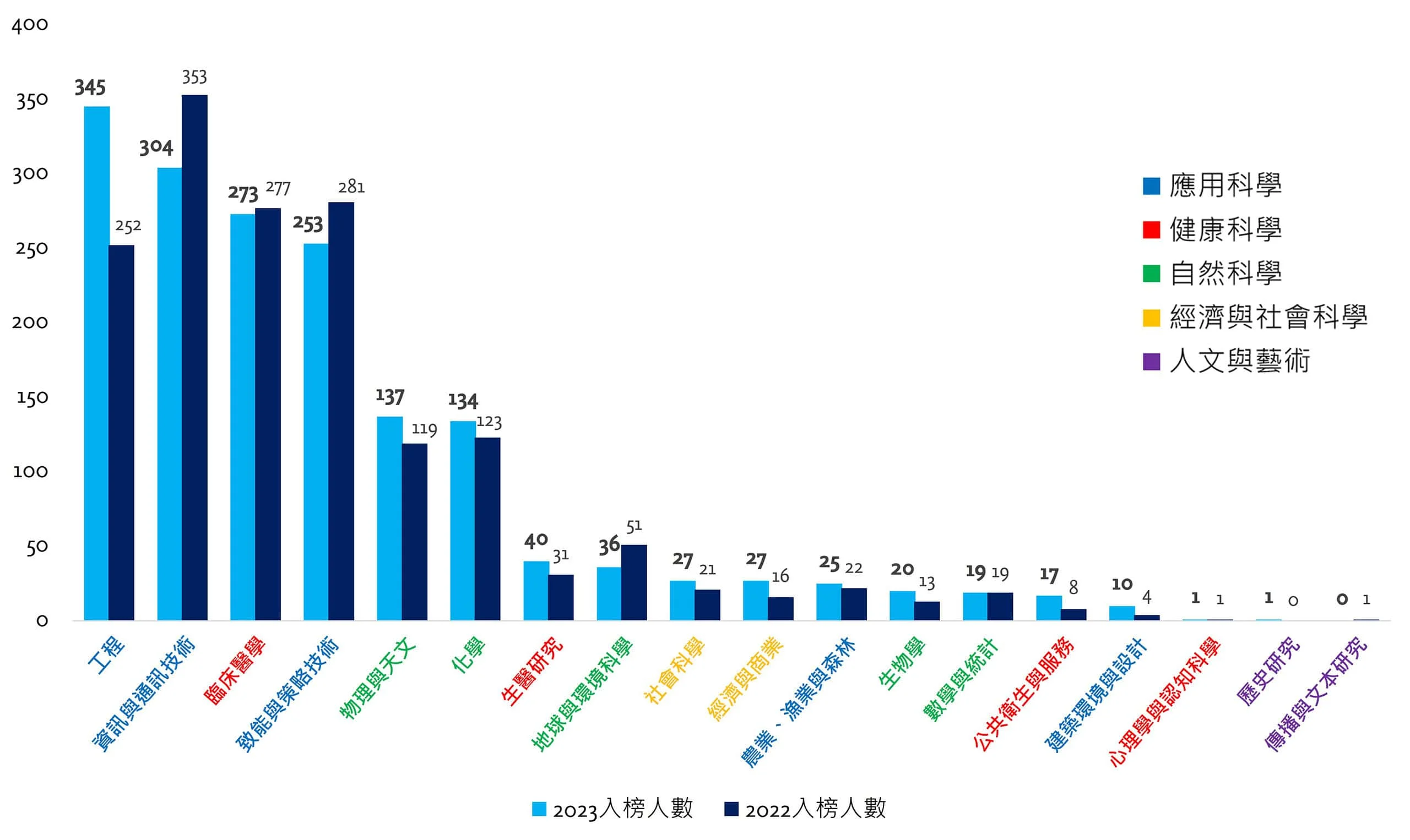 • 臺灣在學科領域入榜人數增加最多的是工程領域,從 252 人增加到 345 人。其次最高為物理天文、化學、經濟與商業學科。四個學科入榜人數呈現下滑趨勢,分別為資訊與通訊技術、致能與策略技術(Enabling & Strategic Technologies)、地球與環境科學和臨床醫學,其他學科人數皆呈長。